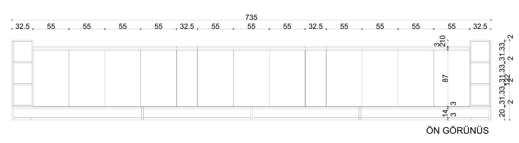 Efe Group Mimarlık olarak, mekânın özgün ihtiyaçlarına yanıt veren, estetikle işlevselliği bir araya getiren bir tasarıma imza attık. Pencere altı için özel olarak geliştirilen, 735 cm uzunluğunda ve 60 cm derinliğindeki bu dolap, mekanın mimari bütünlüğüne kusursuz bir uyum sağlıyor.