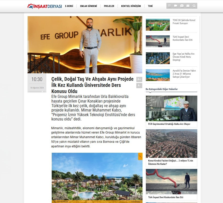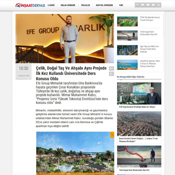 Mimarlık, müteahhitlik, ekonomi danışmanlığı ve gayrimenkul geliştirme alanlarında hizmet veren Efe Group Mimarlık’ın kurucu ortaklarından Mimar Muhammet Kabcı, kurulduğu günden itibaren 50’ye yakın müstakil villanın yanı sıra Bornova ve Çiğli’de apartman inşa ettiğini belirtti. Şu an yapımı süren Balıklıova’daki Çınar Konakları’nın Türkiye’de bir ilk olduğunu belirten Kabcı, şunları söyledi: “8.500 metrekarelik alanda 20 villa olarak tasarladığımız projemizin konstrüksiyonun tamamı yapısal çelikten oluşuyor. Duvarları ise tamamen doğal Alaçatı taşı. Hem çelik hem de doğal taş ile yapılan başka bir proje örneği yok ve bu anlamda Türkiye’de ilkiz. Öyle ki İYTE bizim inşaatı ders konusu olarak inceliyor.”
